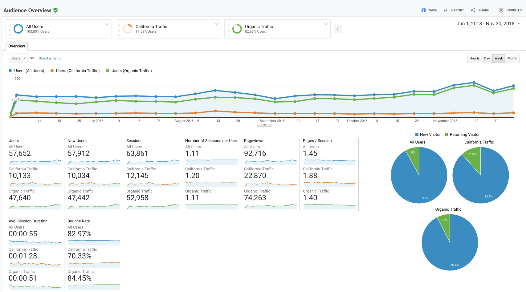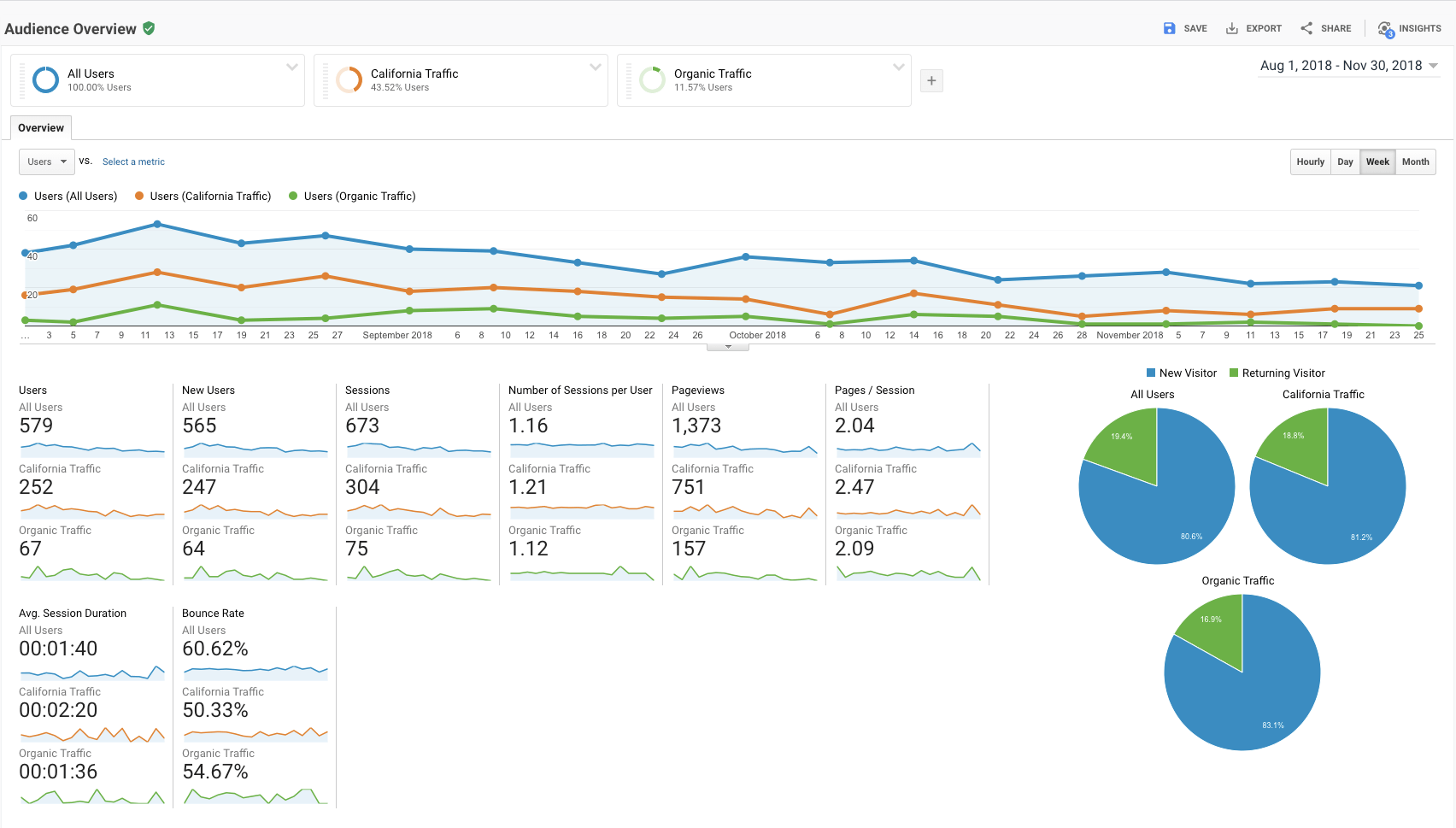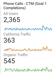 (Blue line is total traffic, Green line is organic search traffic, Orange line is California traffic)